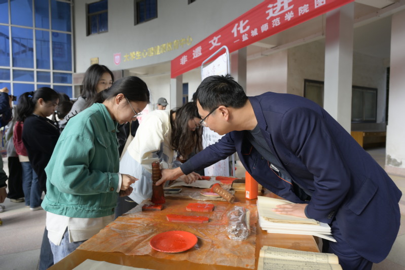 活动现场,普通的红纸在剪纸非遗传承人郑荣军手中折叠、剪裁,不一会儿便化作一幅幅寓意美好的吉祥图样,引来阵阵惊叹。面塑传承人许根洋将各色面团捏塑成栩栩如生的人物与动物,造型生动、色彩鲜明,吸引众多同学驻足尝试。古籍修复与装帧非遗传承人戚九龙现场演示古籍装帧与雕版传拓两项传统技艺,不仅重现线装书的制作过程,更通过传拓将雕版图案清晰地转印于宣纸之上,让师生领略到传统技艺的精妙。活动现场气氛热烈,师生踊跃参与。在各个非遗展台前,大家排起长队,有序观摩、亲身体验。