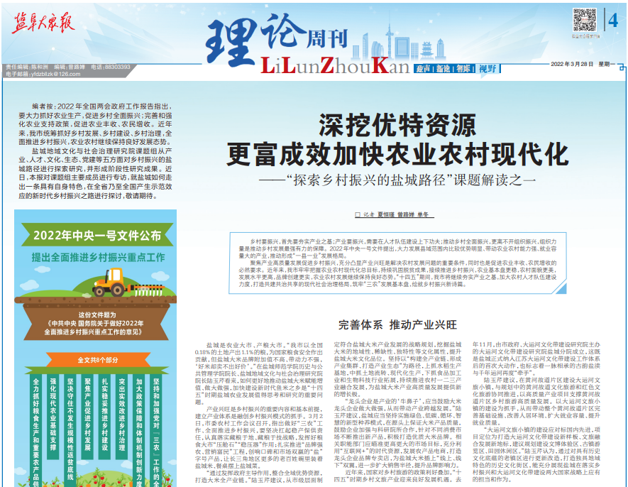 近日,《盐阜大众报》(理论周刊)以“深挖优特资源更富成效加快农业农村现代化”“利用文化资源禀赋 注入精神动力和支撑”“聚力提质增效 打造美丽宜居乡村新风貌”为题连续三期对beat365市级智库平台—盐城地域文化与社会治理研究院的研究成果进行系列报道。该研究报告为2021年度盐城社科联重大招标课题“探索乡村振兴的盐城路径”最终研究成果,自课题开展以来,课题组已在《调查研究》《社科资政》等刊物发表阶段性...