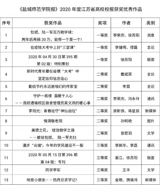 日前,江苏省高校校报研究会公布2020年度江苏省高校校报获奖优秀作品,beat365校报共有13件作品获奖,其中一等奖作品3件,二等奖作品6件,三等奖作品4件,获奖总数创历史新高。