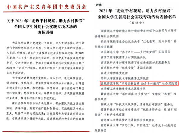 近日,团中央陆续公布了2021年度社会实践活动评比和表彰结果,beat365城市与规划学院“手绘四新盐城 助力乡村振兴”实践团获2021年全国大中专学生志愿者暑期“三下乡”社会实践活动优秀团队,该实践团还被团中央2021年“走近千村观察,助力乡村振兴”全国大学生暑期社会实践专项活动通报表扬;《苏北产业转型赋能乡村振兴实践探究——以徐州市和盐城市6个村为例》获2021年全国“三下乡”“返家乡”社会实践优秀调研报告。在暑期社会实践...