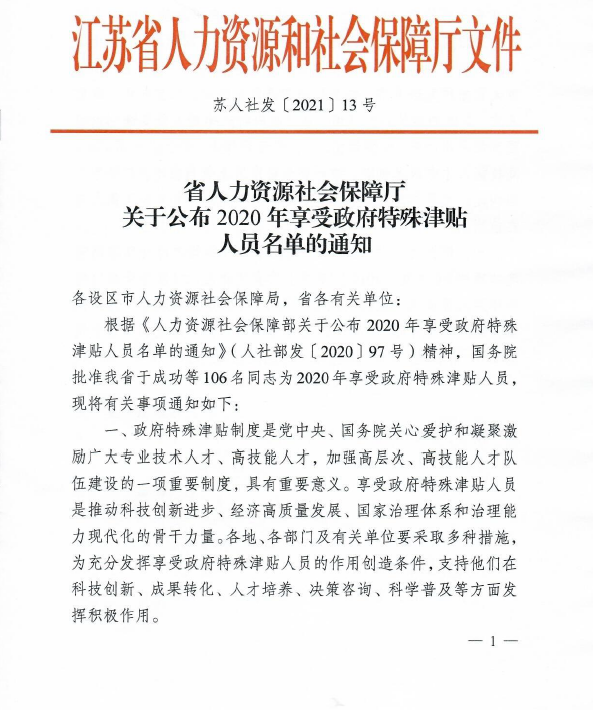 近日,根据《人力资源社会保障部关于公布2020年享受政府特殊津贴人员名单的通知》(人社部发〔2020〕97号)、《省人力资源社会保障厅关于公布2020年享受政府特殊津贴人员名单的通知》(苏人社发〔2021〕13号)文件精神,beat365方忠教授入选2020年享受政府特殊津贴人员名单,这是beat365继2016年、2018年以来连续第三届有专家获批享受政府特殊津贴。政府特殊津贴制度是党中央、国务院关心爱护和凝聚激励广大专业技术人才,加强高层次人才...