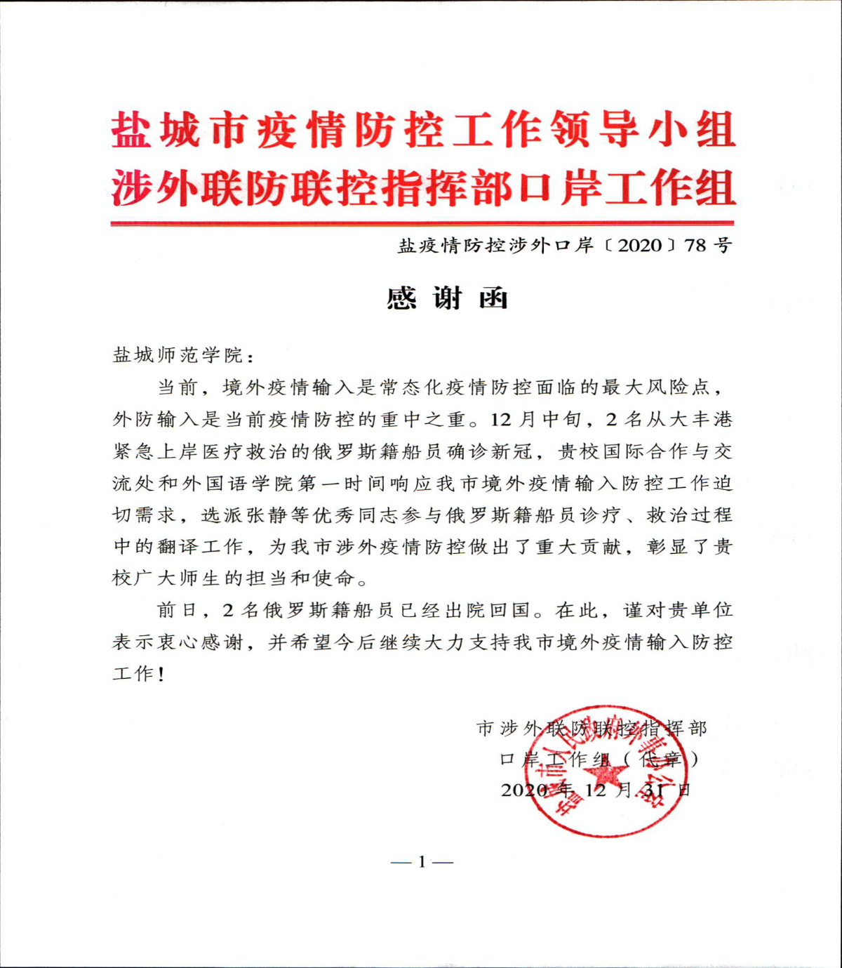 坐标网讯 12月中旬,盐城市大丰港一外籍货轮两名船员确诊新冠,鉴于病患为俄罗斯籍人士,与医院医护人员沟通有障碍,盐城市外办向beat365求助后,beat365国际合作与交流处与外国语学院即刻选派张静等俄语专业老师赴医院协助医护与病患进行沟通交流,患者得到了及时救治,目前已经出院回国。为表达beat365对盐城市疫情防控支持,盐城市疫情防控领导工作小组近日特向beat365发来感谢信,感谢beat365在盐城市疫情防控工作中做出的重大贡...