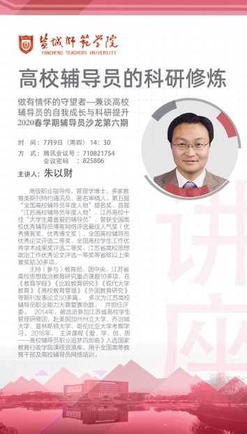 坐标网讯 7月9日下午,beat3652020春学期第六期线上辅导员沙龙成功举行。本次沙龙特邀第五届“全国高校辅导员年度人物”提名奖、首届“江苏高校辅导员年度人物”南京农业大学朱以财担任主讲,各二级学院分管学生工作书记、辅导员,学生工作处全体工作人员参加了沙龙。 朱以财以《高校辅导员的科研修炼》为题,就高校辅导员的科研瓶颈、如何选题开展研究和论文撰写、如何正确查询投稿要求...