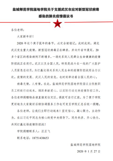 坐标网讯 近期,湖北武汉出现的新型冠状病毒肺炎疫情牵动着全国人民的心。1月27日(大年初三),湿地学院紧急开展武汉抗击疫情捐助活动,向全体教职员工发出关于支援武汉市应对新型冠状病毒感染的肺炎疫情倡议书。倡议书一经发出,湿地学院全体教职员工立即响应,纷纷奉献爱心。截至目前,共收到善款6000元,已于第一时间汇入武汉新型冠状病毒肺炎防控指挥部指定账户。湿地学院院长唐伯平教授表示“湿地学院以爱的名义开展新...